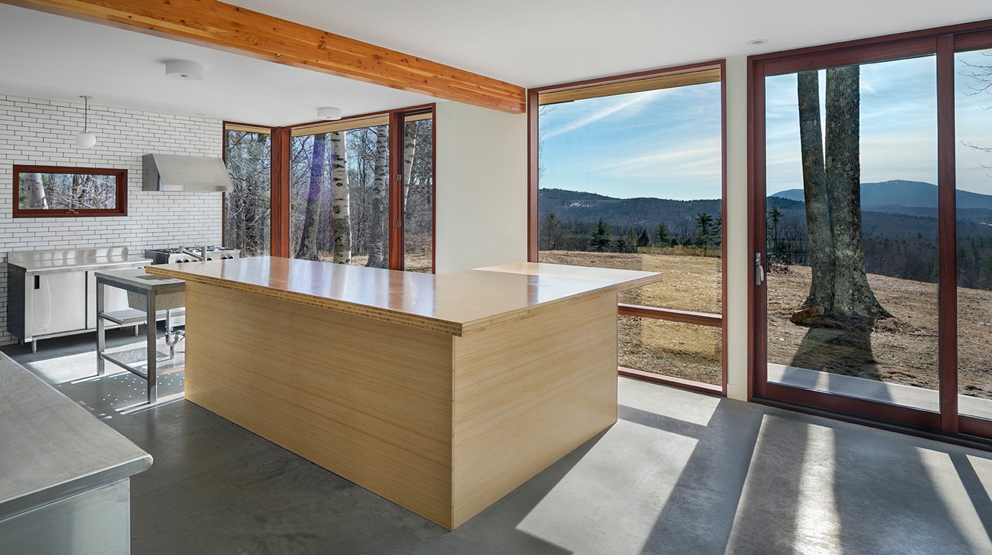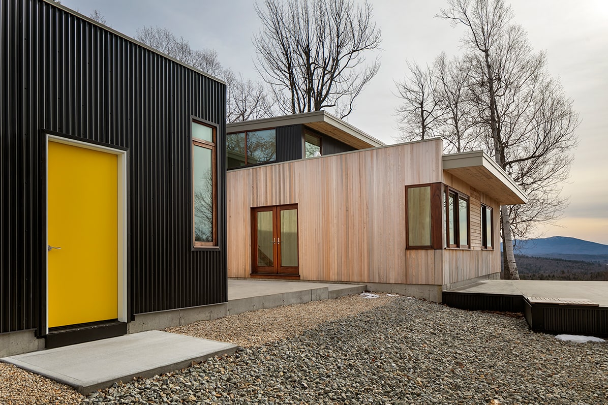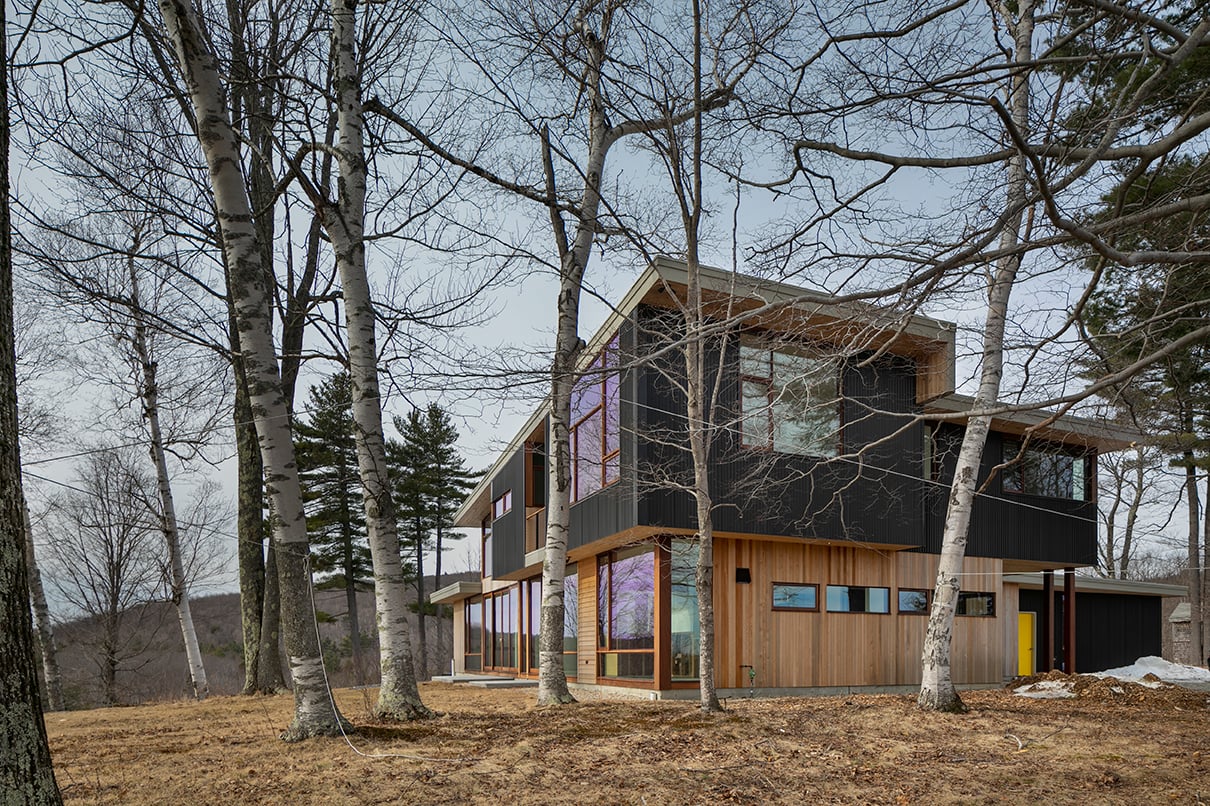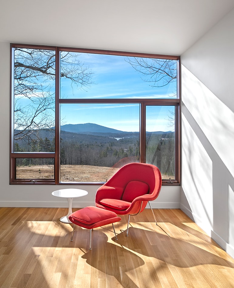 Monadnock Retreat is a striking NextHouse nestled amongst the mountains of New Hampshire. It features an expansive open floor plan and floor-to-ceiling walls of glass to capture the views. This home has three bedrooms and two-and-a-half baths, including a master bath with an open-air shower and balcony.