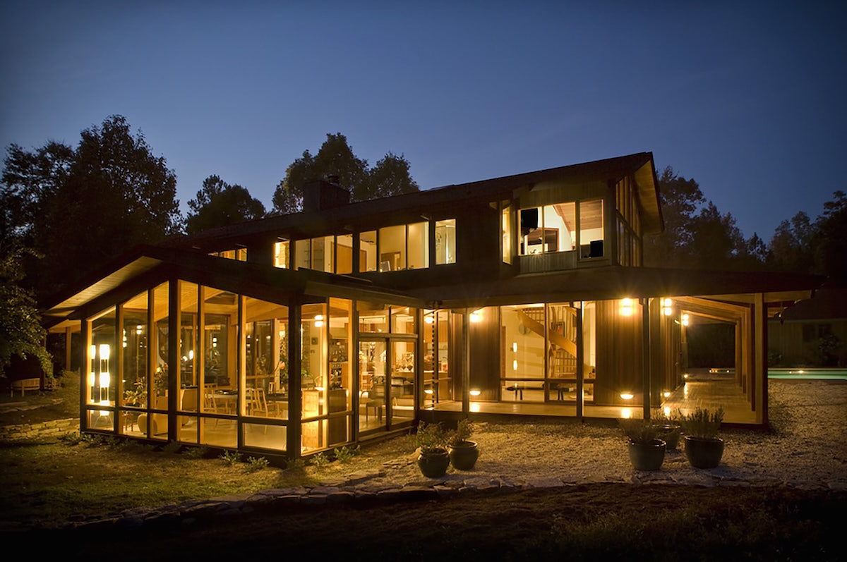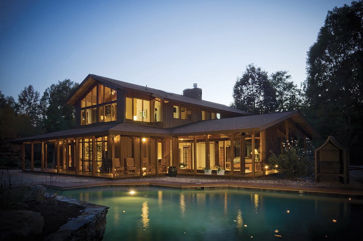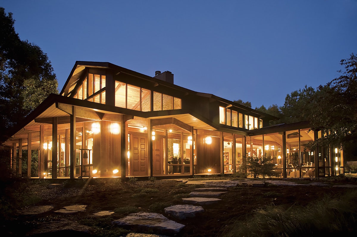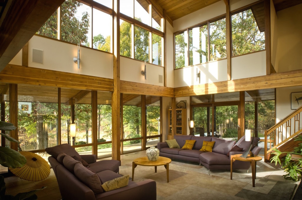 This Signature Deck House design fulfills the clients’ wish for a home that features elements reminiscent of Japan. Floor to ceiling walls of glass allow light to flood the interior and a broad palette of natural materials create texture and contrast. A wrap-around veranda acts as a transition between indoors and out. This strong connection to the site frames it in such a way that the existing natural features become the interior decoration. Two other Deck House structures, a 3-car garage and pottery studio, complete the compound.