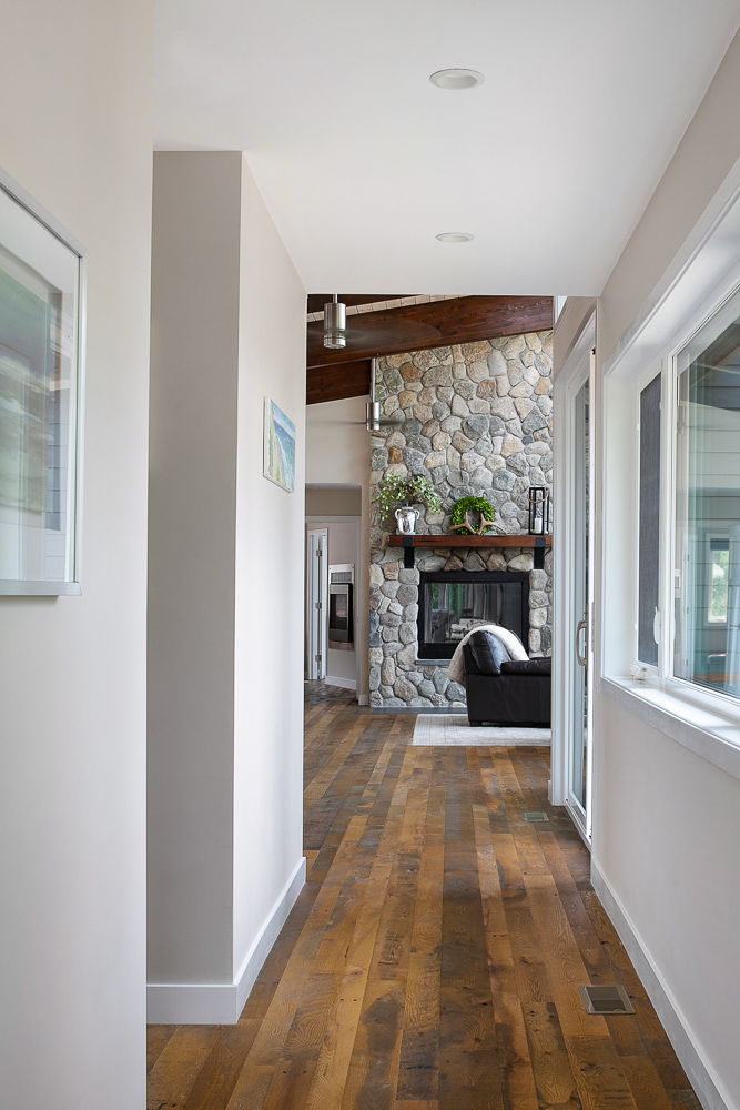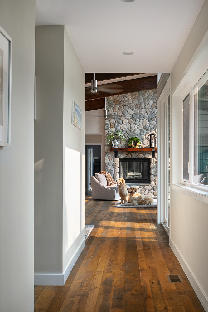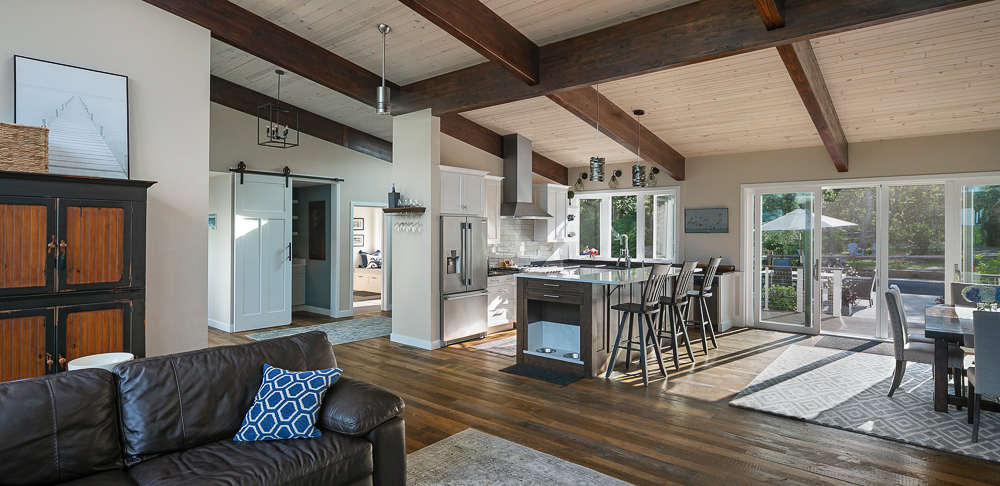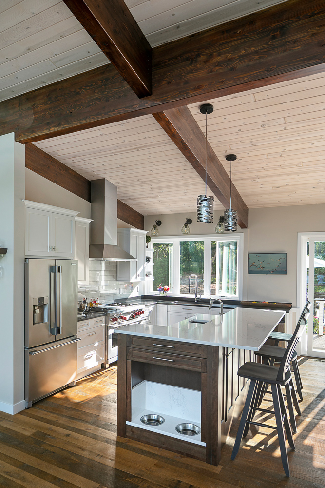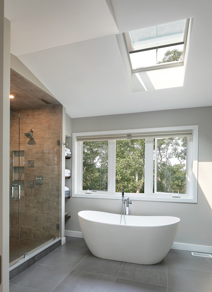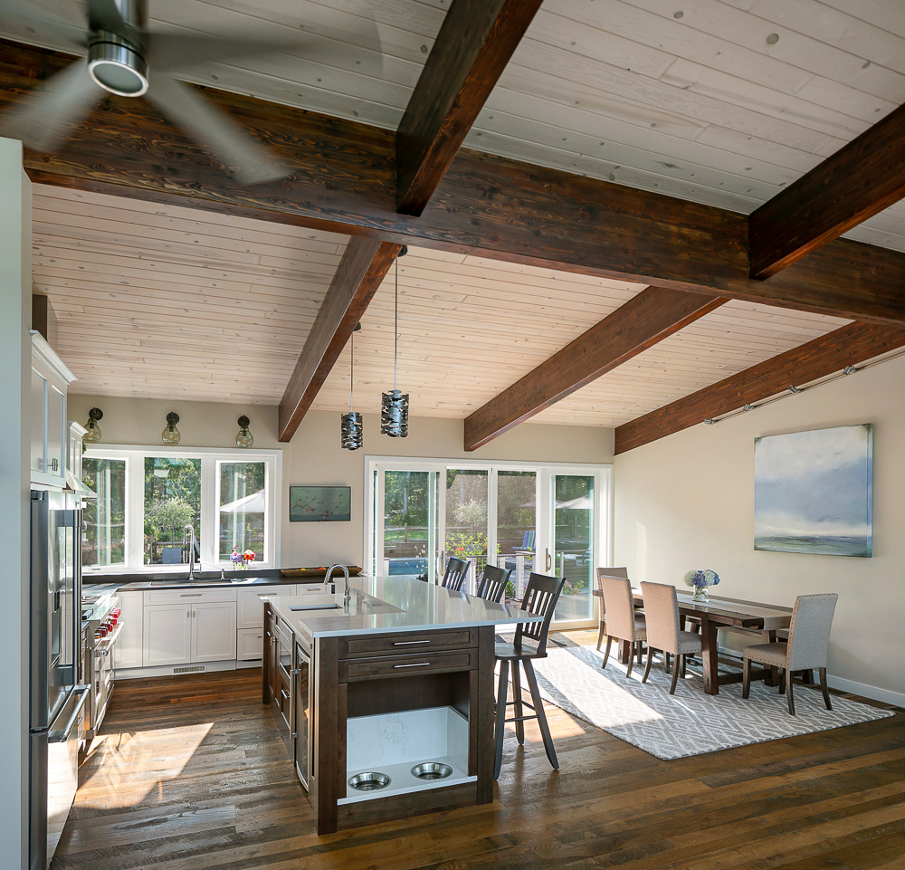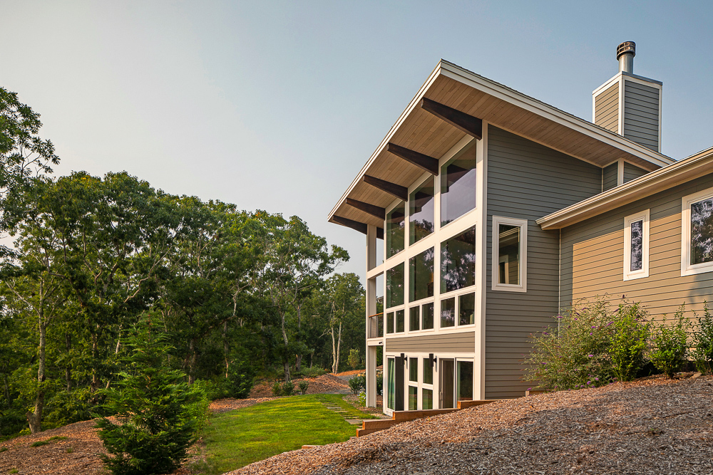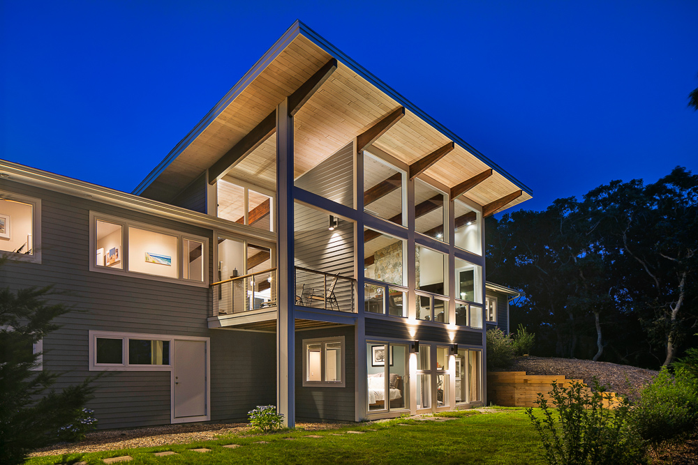 Sited on a parcel of land abutting the Cape Cod National Seashore, this modern farmhouse embraces both its coastal and wooded surroundings. The 2,600-square-foot home, fittingly named Truro Treehouse, sits perched atop a hill overlooking acres of private forest and beautifully landscaped gardens. It features exposed post and beam construction, which not only brings beauty and warmth to the interior but also allows for cathedral ceilings and expansive walls of glass, blurring the line between indoors and out. Read more on our blog here.